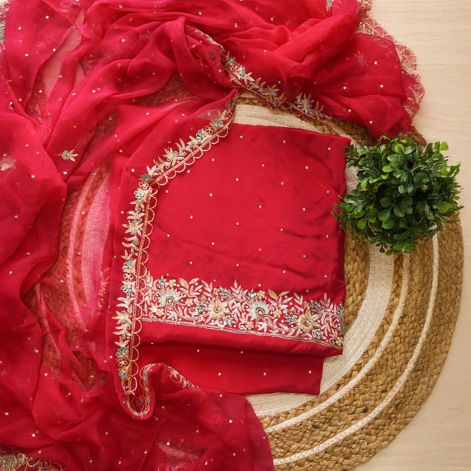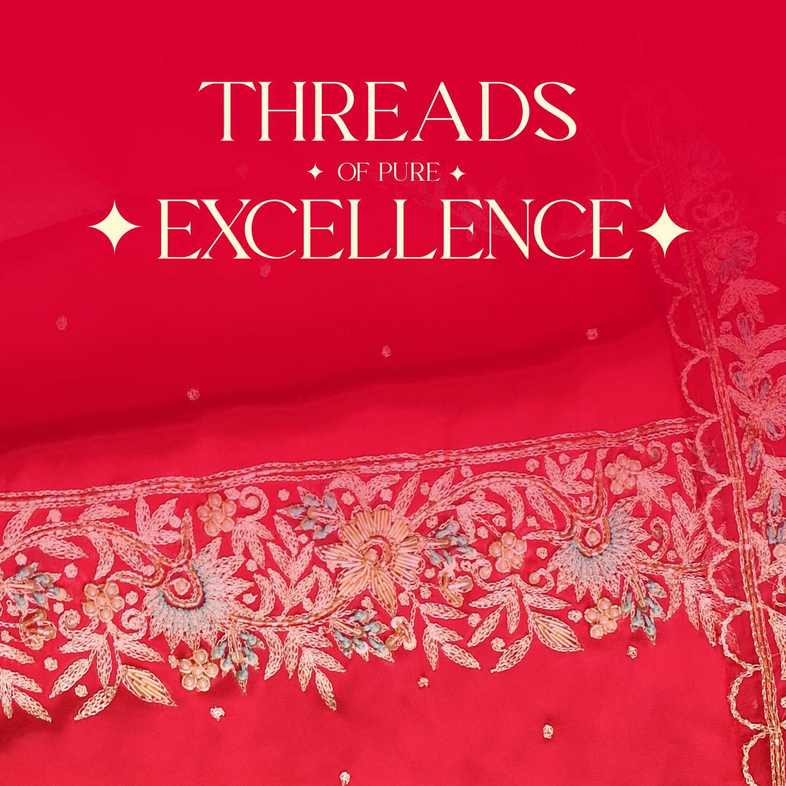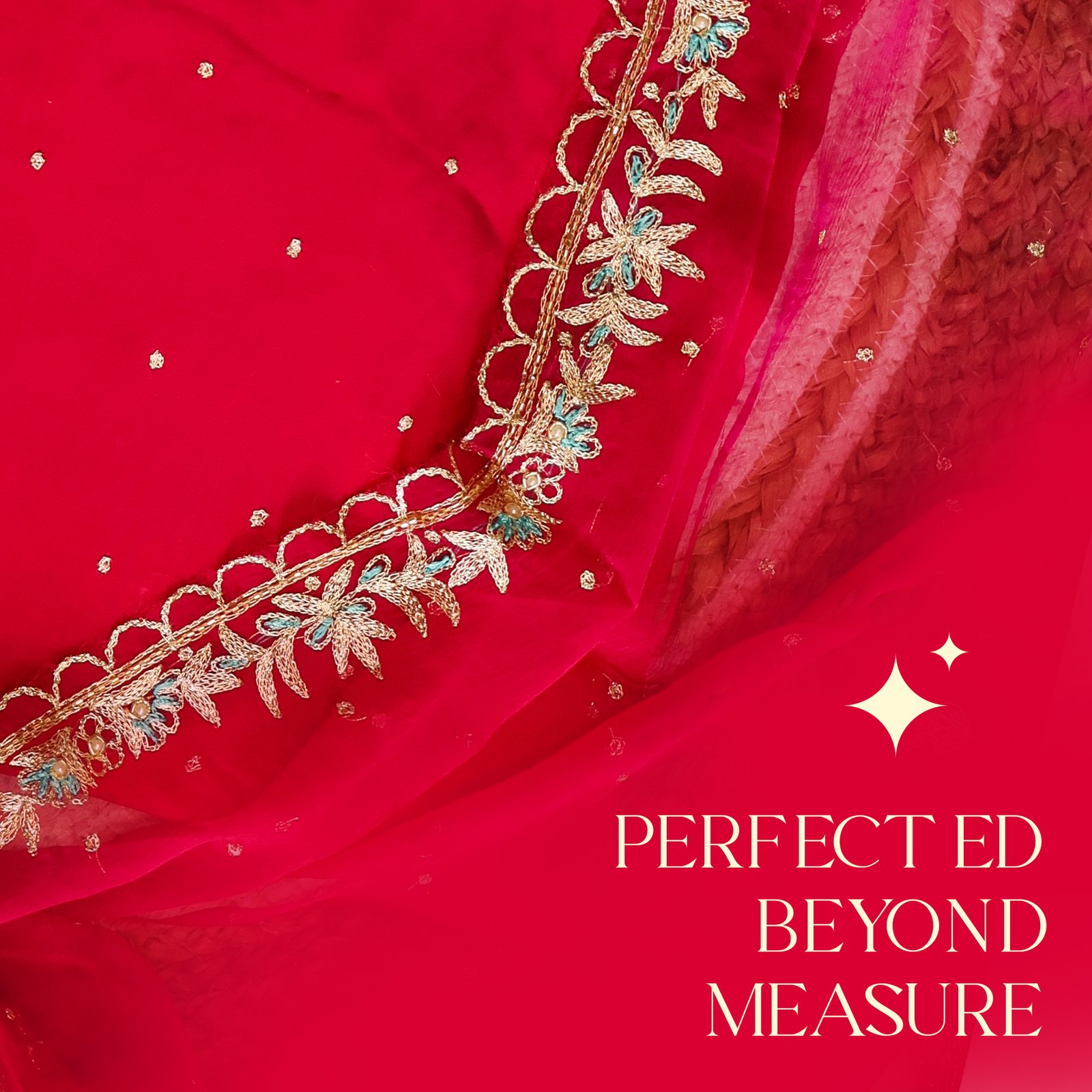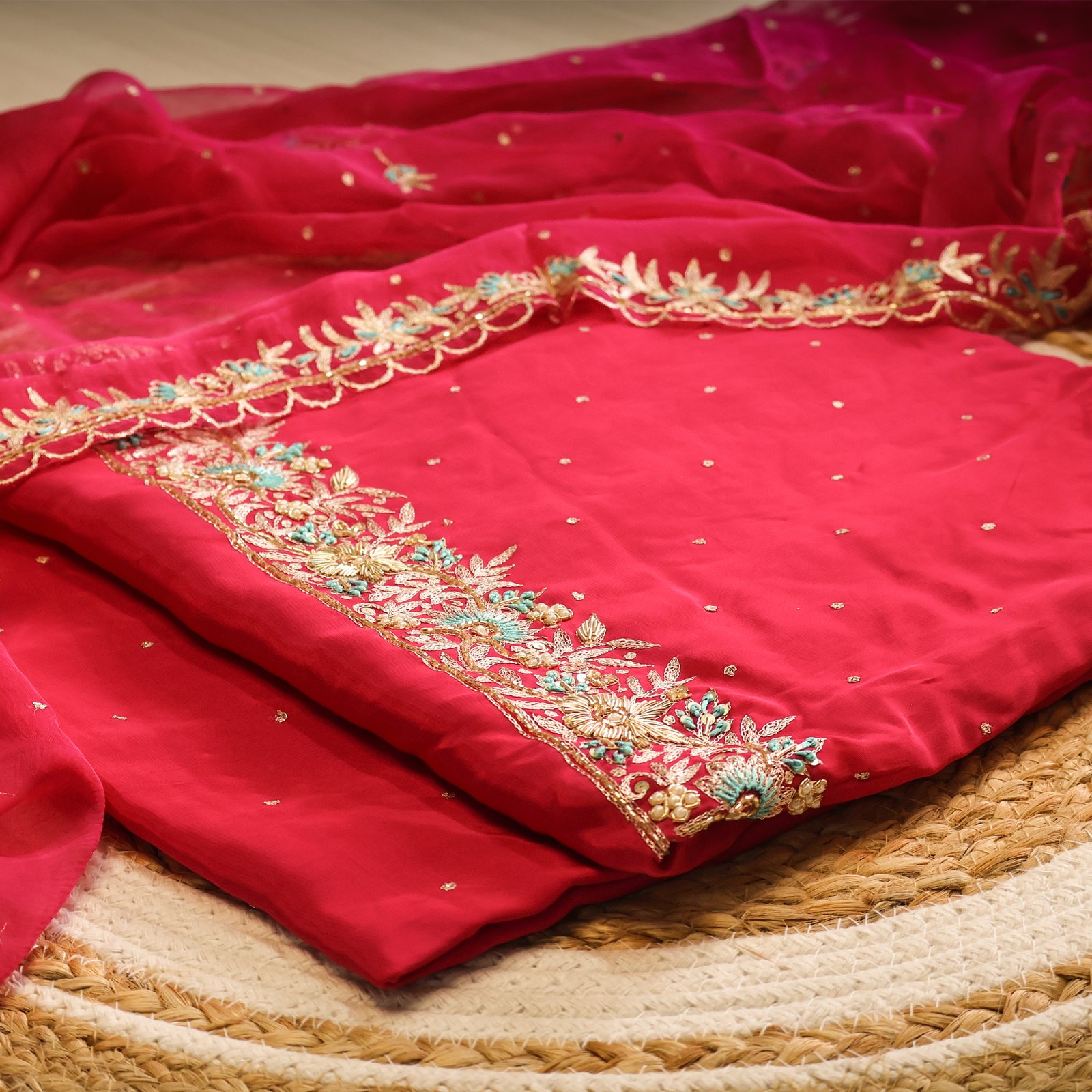 • Golden floral embroidery on the border